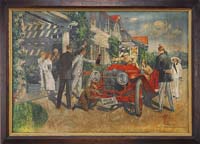 I.W. HARPER WHISKEY ADVERTISING SIGN. Lovely summer’s day illustration by Crompton of a newlywed couple making their reception getaway in a bright red open touring car. The sign is titled on the frame “The Parting Gift” which would refer to the bottle of Harper Whiskey being handed to the groom from the celebratory group of wellwishers. Textured chromolithograph on canvas from the Bernheim Distilling Co., copyright 1912. SIZE: 44-1/2″ w x 32-1/2″ h. CONDITION: Good to very good with overall craquelature to the surface and two small canvas tears. The frame liner has been repainted with some paint loss at bottom left corner. 1-8232 PF (700-900)