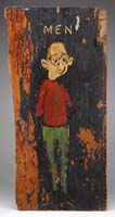 FOLK ART DOOR. Plywood door fragment from Boston bar “Sevens”. Painted by OMar White, a cartoonist for the Boston Herald American. Appears to be former men’s room entrance. SIZE: 27″ w x 54-1/2″ h. CONDITION: Fair. 1-8277 PF (150-250)