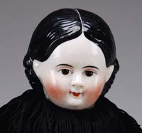 THREE GERMAN BISQUE HEAD DOLLS. 1) Glass eyed bisque shoulder head, originally dressed in lambswool coat with rabbit ears mounted on a music box and known as a marotte. One holds the wooden stick, twirls the doll and the music plays. 2) Closed mouth bisque shoulder head with glass sleep eyes incised “172 Made in Germany” known as Kestner “Gibson Girl”. She is on her original cloth body with bisque lower arms and legs with molded and painted stockings and boots. 3) Gerbruder Heubach glass eyed Googly incised “9573” with Heubach “square” mark. She has sleep blue eyes, closed mouth and is on original five piece composition body with painted shoes and socks. SIZE: 12″ (31cm), 10″ (25.5cm) and 7″ (19cm) respectively. CONDITION: Very good; Gibson Girl has two chipped fingers on inside of right hand. 1-8135-1 RS (900-1,200)