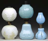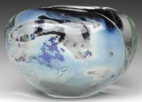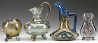 THREE CONTEMPORARY ART GLASS OBJECTS. 1) Art glass object in the form of a jellyfish in blue iridescent glass having white, clear and blue shards attached. Signed on the underside in script “Dexter 1984”. 2) Blue iridescent lava decorated vase of organic form. This vase has outrageous purple and green iridescence. Signed “Eickholt 1985”. 3) Art Deco influenced baluster shaped vase with flared rim has a matte black background with platinum iridescent finish to overall design. Signed on the bottom rim in script “Elaine Hyde MGS.KR 1989”. SIZE: 8″ across, 5-1/4″ t and 9″ t respectively. PROVENANCE: From the Collection of Dr. & Mrs. Ivan Cohen. CONDITION: All three pieces are very good to excellent. 5-62910 (300-500)