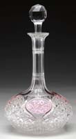 INTERNALLY PAINTED SCENT BOTTLE. Wonderful Oriental design scent bottle is blown in heavy clear glass with squared, slightly curving sides. The oval interior of the bottle is painted with an Oriental scene of cranes in pine trees with a bright sun in the sky. Bottle is finished with a red stone stopper with felt stem. Artist signed on the interior. SIZE: 3-1/2″ t. PROVENANCE: From the Collection of Dr. & Mrs. Ivan Cohen. CONDITION: Very good to excellent. 5-62926 (100-300)