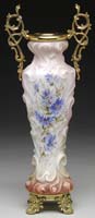 DAUM NANCY FRENCH CAMEO VASE. Bulbous form footed vase has a slender neck flaring to a wide mouth rim. The vase is decorated with a rare blue coloration of flowers and foliage which are heavily carved and well detailed. This design is set upon a heavily mottled blue, yellow and lavender ground. Carved “Daum Nancy France” with Cross of Lorraine to side of foot. SIZE: 17-1/2″ t. CONDITION: Very good to excellent. 5-62176 (10,000-15,000)