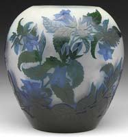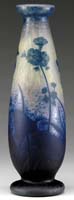 DAUM NANCY FRENCH CAMEO VASE. Wheel carved bulbous top vase is decorated with applied blue glass set against green foliage. All of this is on a mottled apricot background, receding to a multi-shaded purple saucer foot. Signed “Daum Nancy” with Cross of Lorraine to side of vase. SIZE: 9″ t. CONDITION: Very good to excellent. 5-62525 (5,000-6,000)