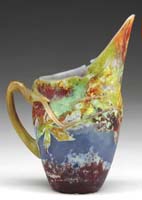 DAUM NANCY FRENCH CAMEO MUG. Executed with a highly decorative art nouveau pattern of flowers and foliage, this windswept design in hues of blue, crystal and gold, rests upon a mottled ground of yellow and pink glass. Further complementing this mug is an applied glass handle with matching Art Nouveau design. Tumbler is finished at bulbous bottom with a gold floral decoration. Signed under foot “Daum Nancy” with Cross of Lorraine. SIZE: 5-3/4″ t. CONDITION: Very good, except for what appears to be a missing second handle. 5-62676 (2,000-4,000)
