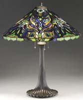 DUFFNER & KIMBERLY PEACOCK TABLE LAMP. Intricately design, fully leaded shade depicts peacock feathers with eyes in full plumage. Colors used in these feathers are deep blues and purples. Some of the glass is heavily textured while other pieces are more plain and simple. The eyes of the feathers have an outline of yellow glass which encircles green glass and ends with deep purple as the eyes. All of this is set on a heavily textured ground in colors of green and amber. This conical shade is finished with an irregular border. Representing the epitome of the art nouveau period, this shade flows from one color to another beautifully. Shade is supported by an original Duffner & Kimberly four socket base with vertical ribbing extending down to the circular foot. The vertical ribbing is reminiscent of feathers and complements the shade perfectly. Base is completed with four acorn pull chains, sockets, a heart pierced bell housing, matching top cap and finial. The entire lamp carries a desirable patina finish. This lamp may be further referenced in the book Mosaic Shades Vol. II by Paul Crist, page 183. The lamp is accompanied by a letter of authenticity from Paul Crist Studios. SIZE: Shade is 22″ dia. Lamp is 27″ t. CONDITION: Very good to excellent with very few if any tight hairlines on shade. Base has one loose socket. 5-62186 (45,000-55,000)