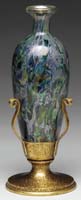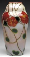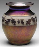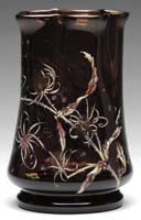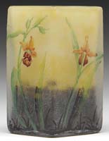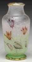 DAUM NANCY CAMEO & ENAMELED VASE. Bulbous-shape footed vase has an elongated neck and is finished with gold on upper lip and foot. Iridescent and textured ground is decorated with red bleeding hearts and gold highlights at foliage. This is a fine, rare vase, dated October 18, 1900, in gold. Signed “Daum Nancy” with Cross of Lorraine to underside of foot. SIZE: 7-3/4″ t. CONDITION: Very good to excellent. 5-62780 (2,750-3,750)