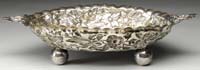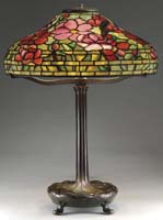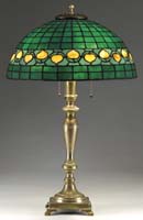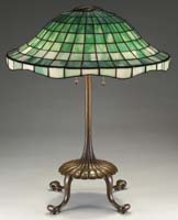 BIGELOW & KENNARD GRUEBY TABLE LAMP. Fully leaded shade has a white geometric background and is decorated with a green leaf pattern at border. Shade is supported by a pottery base of organic form in green with yellow at tips of flowers. Base is finished with three sockets, three acorn pulls, top cap and finial. Shade is signed “Bigelow & Kennard Boston”. Base is signed on the underside “Grueby Pottery Boston USA” and artist initialed “E.R.”. Also has paper label “Grueby Pottery Boston USA” and has another label “Grueby Pottery Price $20 No. 11946”. SIZE: Shade is 12″ dia. Lamp is 15″ t. CONDITION: Shade is very good to excellent with a few tight hairlines. Base is very good to excellent with some minor wear to finish on hardware. 5-62461 (4,000-6,000)