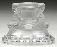 VALERIE SURJAN ART DECO LUMINAIRE. Outstanding art deco style luminaire features a clear and frosted glass screen with enameled pink flowers. Clear section of the screen is a nude woman holding out her nylon preparing to dress. The screen is complete with original black luminaire lighted base. Along with the screen is a smoked glass upholstered chair which sits separately beside the screen giving a wonderful three dimensional effect. Screen is signed “Valerie Surjan 1987” and the chair is signed “Surjan 1987”. SIZE: 13-1/4″ t. PROVENANCE: From the Collection of Dr. & Mrs. Ivan Cohen. CONDITION: Very good to excellent. 5-62916 (500-1,000)