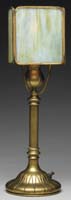 SUESS LEADED TABLE LAMP. Parasol style leaded shade is comprised of green and white striated glass and has an irregular border. Shade is supported by a bronze base of high art nouveau styling with four large curved legs supporting a vertically ribbed platform that extends upward to a single stem, three sockets with acorn pulls and original top cap complete the lamp. A similar shade may be found in an original 1906 Suess Ornamental Glass Co. Chicago, IL catalog. SIZE: Shade is 18″ dia. Lamp is 22″ t. CONDITION: Very good to excellent with a few tight hairlines. Base is very good to excellent. 5-62203 (1,500-2,500)