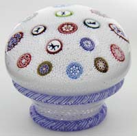 FOUR ARTIST SIGNED PAPERWEIGHTS. Nice collection of paperweights features an upright weight with dragonfly hovering over a white flower with green stem and leaves against a blue background. Signed “Union Jack 350/86”. The next weight has a clear glass oval body encasing a black sphere with uneven horizontal lines of white, blue, gold and pink. Signed what appears to be “Kesla Baelu”. The next weight has swirling stylized canes of purple, yellow and green encased in a clear body. Signed on the bottom “Ann Schuly”. The final weight has pink and white millefiori canes against a royal blue background encased in a clear faceted body. Signed on the bottom with a single came “IT 98″. SIZE: Tallest is 4”. PROVENANCE: From the Collection of Dr. & Mrs. Ivan Cohen. CONDITION: Very good to excellent. 5-62879 (200-400)