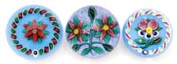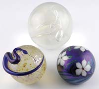THREE SIGNED CONTEMPORARY PAPERWEIGHTS. 1) Round globe with freeform internal decoration with wispy glittering iridescent colors. Signed on the underside illegibly. 2) Round paperweight with applied blue iridescent snake against a gold iridescent oil spot decoration. Signed on the underside with illegible signature as well as “WSGS 6.89.10”. 3) Blue iridescent paperweight decorated with three white flowers and green leaves and stems. Iridescence has strong purple highlights. Signed on the underside “Union Jack K. Radtke 895/1986”. SIZE: Largest is 4″ t. PROVENANCE: From the Collection of Dr. & Mrs. Ivan Cohen. CONDITION: All are very good to excellent. 5-62905 (200-400)