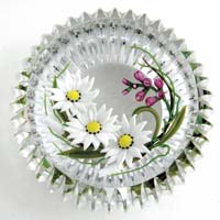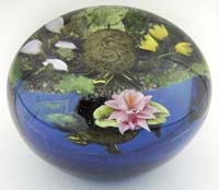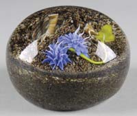 DANIEL SALAZAR PAPERWEIGHT. Very pretty paperweight done by Daniel Salazar for Lundberg Studios features a single orchid flower in yellow, purple and lavender against four rich green variegated leaves. Signed on bottom edge “Daniel Salazar Lundberg Studios 1988”. SIZE: 2-1/2″ t. PROVENANCE: From the Collection of Dr. & Mrs. Ivan Cohen. CONDITION: Very good to excellent. 5-62901 (200-400)