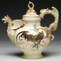 RICHARD CLEMENTS TEAPOT. Beautifully blown teapot has red and green zipper pattern, vertical lines against a creamy opalescent background with a short squat spout. Teapot is finished with a matching lid and applied clear glass handle. Signed on the underside “Clements 1990”. SIZE: 3-1/2″ t. PROVENANCE: From the Collection of Dr. & Mrs. Ivan Cohen. CONDITION: Very good to excellent. 5-62921 (300-500)