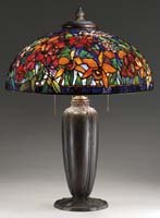 SUESS LEADED TULIP TABLE LAMP. Extremely rare, fully leaded shade depicts tulips in various stages of bloom in many colors including pink, blue, yellow and peach. Each tulip having a multitude of green shaded glass representing the foliage. This design is on a vivid white geometric ground and is finished with a caramel glass border. Shade is supported by a simple three socket base with an art nouveau foliage pattern at large circle foot. Lamp is finished with an ornate floral top cap. SIZE: Shade is 20″ dia. Lamp is 24″ t. CONDITION: Several false lead lines with minor restoration to leaving. Base is very good to excellent with three replaced sockets and pull chains. Underside of base shows unusual loss of color. 5-62206 (4,000-6,000)