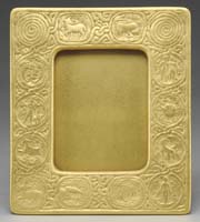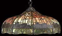 DUFFNER & KIMBERLY LEADED HANGING SHADE. Tuck under shade has alternating panels of yellow mottled glass in a fish scale design which complement four alternating columns of stylized art nouveau shells. The colors used in this pattern are deep amber, to softer butterscotch, to soft cream. The tuck under border has an art nouveau design which encircles the shade. Shade is complete with a wonderful allover gold finish to lead work. Aperture of shade shows that this shade was originally constructed to be a hanger. SIZE: Shade is 24″ dia. CONDITION: Very good to excellent with very few, if any tight hairlines. 5-62474 (3,500-4,500)