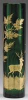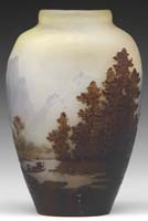 MONUMENTAL DAUM NANCY FRENCH CAMEO VASE. Monumental size vase is of bulbous form with elongated neck and flared rim. A reflected lake scene as viewed through trees is depicted in several layers of acid cut-back work. The predominant colors being green and blue on a softly mottled green, blue and frosted ground. Signed on the side in cameo “Daum Nancy” with Cross of Lorraine. SIZE: 16-1/4″ t. CONDITION: Very good to excellent. 5-62276 (2,500-4,500)