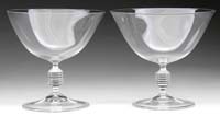 TWO VAN DEURZEN CHALICES. Two fun chalices have black applied feet supporting wavy stems of randomly striped glass encased in clear supporting colored bowls with gold glass threading. Each stem has two applied colored glass nubs on each side. Each are signed on the underside “Van Deurzen 89″. SIZE: Tallest is 14-1/4”. PROVENANCE: From the Collection of Dr. & Mrs. Ivan Cohen. CONDITION: Very good to excellent. 5-62923 (800-1,200)
