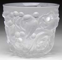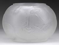 DAUM NANCY OWL VASE. Art Deco style vase is decorated in the manner of an owl with two applied cabochons backed by going foil and a pointed cabochon which represents the beak. The vase is acid cutback to detail feathers, talons and face in various shades of brown on a green mottled glass background. Signed on the underside “Daum Nancy” with Cross of Lorraine. SIZE: 7-1/4″ t. CONDITION: Very good to excellent. 5-62524 (5,000-6,000)