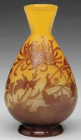 GALLE FRENCH CAMEO VASE. Pedestal foot, bulbous vase with flared lip has an orange background decorated with purple chrysanthemums in various stages of bloom. Signed “Galle” in cameo to side of vase. SIZE: 6-1/4″ t. CONDITION: Very good to excellent. 5-62718 (1,000-1,500)