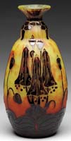 DAUM NANCY MUSHROOM FRENCH CAMEO VASE. Gourd-shaped vase with elongated neck has a brilliant mottled orange and yellow ground which is decorated with an outrageous pattern of wheel-carved and enameled mushrooms in earthen browns, oranges and greens with deeper greens representing the ground at the bottom of vase. This mushroom design is wheel-carved and enameled in minute detailing. It is one of the finest examples we have ever offered. Signed on the underside with carved “Daum Nancy” with Cross of Lorraine. SIZE: 9″ t. CONDITION: Very good to excellent. 5-62772 (12,000-15,000)