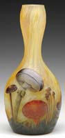 DAUM NANCY MUSHROOM VASE. Rare and outstanding shoulder form vase with wide pedestal foot and two applied handles is decorated with an allover mushroom design in cameo and enamel. This mushroom design has brilliant orange colors with brown and earthen greens. The mushrooms are beautifully detailed and have a life-like feel. Signed “Daum Nancy” with Cross of Lorraine to underside of foot. SIZE: 5-3/4″ t. CONDITION: Very good to excellent. 5-62177 (10,000-15,000)