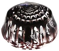 KARBLER & DAVID BULLS EYE BOWL. Very interesting glass and granite bowl features small center bowl opening surrounded by concentric circles of green, gold, maroon, purple and blue giving the bowl a bulls eye sculpture appearance. Glass is mounted against two polished granite legs. Center section of the bowl is polished, while the outer two sides are frosted. Signed on the underside “Kit Karbler 28753 Michael David”. SIZE: 9-1/2″ w x 4″ t. PROVENANCE: From the Collection of Dr. & Mrs. Ivan Cohen. CONDITION: Three small nicks to inside lip of bowl, otherwise very good. 5-62897 (500-700)