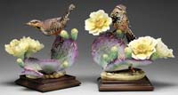 PAIR OF SMALL CARVED AND PAINTED FLORAL DECORATIONS. Japan, early 20th century. Each polychrome decorated flowering plant mounted in a pot. Both carved of ivory. Each signed. SIZE: 3″ h overall. CONDITION: One plant with detached leaf (still present). Otherwise very good overall. 9-24087-2 (200-300)
