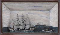 HARRY (Henry) CHASE (American, 1853-1889) SURVIVING THE WRECK. Large oil on canvas nautical scene shows a large lifeboat filled with people escaping their wrecked and doomed ship which can be seen in the distance floundering. They have survived a fierce storm which is breaking up with a patch of blue sky & sunlight lighting the central part of the scene. Signed lower left and dated “1881”. Housed in an antique gilt wood frame with gilt liner. SIZE: 24″ x 42-1/4″. CONDITION: Relined with inpainting, very good. 9-24351 (12,000-18,000)