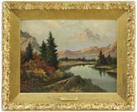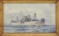 GEORGE E. ESSIG (American, 1838-1926) LEAVING ON A QUIET MORNING. Watercolor scene shows two fishing boats under sail leaving a shoreline harbor area with windmill and other buildings. The bright morning sun is seen reflecting in the water, all in a pastel colored scene. Signed lower right and dated “1910”. Housed in a stained, oak frame with white matte. SIZE: Sight: 15-1/2″ x 26-1/2″. CONDITION: Very good. 9-24362 (1,000-1,500)