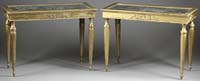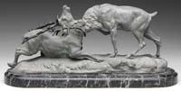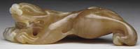 ORIENTAL CARVED HARDSTONE FIGURE OF DOG. 20th century. Whimsical carving in green stone of recumbent dog with crossed front paws. Decorated with polished pinwheels and floral vinery. SIZE: 4-1/2″ h x 9″ l. CONDITION: Very good. 9-22836 (400-600)