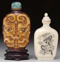 GROUP OF MISCELLANEOUS ORIENTAL ITEMS. 19-20th century. Including two blue and white cameo cut floral decorated snuff bottles; small ivory elephant; three carved fish, two of coral; miniature song bird; Carnelian and celluloid netsuke of a group of tortoises. SIZE: Bottles: 3″ h. Elephant: 1-1/4″ h. CONDITION: One snuff bottle with detached lid (still present). Otherwise all very good. 9-24087 (500-800)
