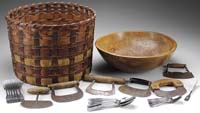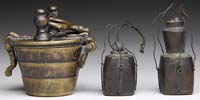 GROUP OF ORIENTAL BRONZE WEIGHTS AND MEASURES. Probably Chinese, 18th/19th century. First two simulating vessels fitted with carrying ropes. Third a bronze bucket with lid revealing a set of four graduated measures and weights of conforming shape. SIZE: 1 & 2) 1-1/2″ & 2″ h. 3) 3-1/4″ h x 2″ dia. PROVENANCE: From a fine Islesboro, Maine home. CONDITION: With old surfaces. Overall good. 9-23875 (100-200)