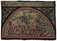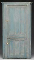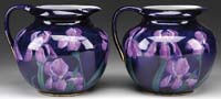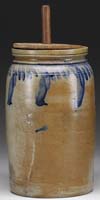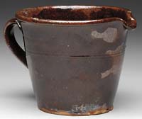 TWO PERSIAN POTTERY ITEMS. 19th Century. The first, a primitive horse modeled in a prancing pose with full trappings. The second glazed example of an indigo urn applied with handles at the throat, decorated overall in black simulating wall hangings. The interior also in a blue glaze. SIZE: Horse: 6-1/4″ h x 6-3/4″ l. Urn: 5-1/2″ h. PROVENANCE: From a fine Islesboro, Maine home. CONDITION: The horse with craquelure. The vase with craquelure and with crack and tight hairlines around rim; otherwise good. 9-23872 (200-400)