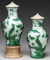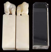 THREE CHINESE SEALS. 20th Century Republic. The first, a clear crystal seal with the initials “K.L.” framed by bamboo. The top of the seal faceted in its original presentation box. Together with a pair of jade seals, not engraved each mounted with an elephant in their original presentation box. SIZE: First: 2-1/2″ h. Pair 2-3/4″ h. CONDITION: Overall very good. 9-24859 (300-500)