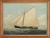 GEORGE M. HATHAWAY (American, 1852-1903) SAILING OFF OWLS HEAD, MAINE. Oil on academy board Maine coastal scene shows a two-mast schooner sailing off a bluff of land with building atop. Signed lower left “G M Hathaway”. Housed in a period gilt molded wood frame. SIZE: 6″ x 12-1/4″. PROVENANCE: Maine Collector. CONDITION: Very good. 9-24178 (800-1,200)