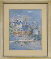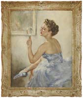 ISABELLE PARKE BRANSON CARTWRIGHT (American, 1885-1966) ALONG THE MAINE COAST & STILL LIFE OF FLOWERS. The two sided oil on canvas shows a rugged coastal view with waves crashing onto cliffs under colorful sky. Signed lower left “I B Cartwright”. The other side shows a blue glass vase of colorful morning glory type flowers. Housed in a modern gilt carved wood frame. SIZE: 15-1/2″ x 22-3/4″. CONDITION: Very good. 9-24944 (800-1,200)