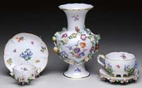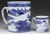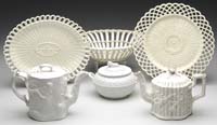 GROUP OF FOUR ORIENTAL CERAMICS. 19th century. Lot includes a footed celadon censer decorated with the eight trigrams “pa jua”; a covered bowl and a cup decorated with underglaze blue designs. Also with an English Leedsware bowl decorated in the Oriental taste. SIZE: Censer: 3-1/2″ dia. Covered bowl: 4-3/4″ h. Leedsware: 6-1/4″ dia. CONDITION: Overall good. Covered bowl with chips to rim. Leedsware bowl with base rim shallow chips, top rim roughness and vertical hairline crack. 9-24023 (200-300)