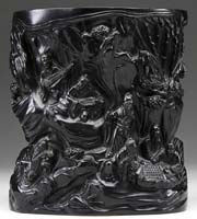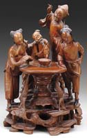 FINE ORIENTAL GROUP CARVING. China, Mid-20th century. The hardwood carving depicting four animated figures in the act of gaming, gathered around around center table in the middle of which is a bowl of dice, the whole on a detailed and ornate rockwork plinth. SIZE: 12″ h. x 8″ dia. CONDITION: Very fine original condition, with good carving, with acceptable and normal shrinkage crack at rear of figural group and loss of fingertip to uppermost figure. 9-24749 (100-150)