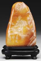 SHADOW AGATE PENDANT. Chinese, 18th century. Of rectangular form, cameo cut in high relief depicting a fisherman in a landscape, reverse with a poem, mounted with amethyst drops at suspension cord. SIZE: 3-3/4″ l overall x 1-1/2″ w. CONDITION: Overall very good with nice polished surfaces. 9-24210-3 (200-300)