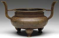 ORNATE BRONZE CENSER. Chinese, 20th century. With elephant handles and foo dog finial. Decorated with cranes at the side. SIZE: 5-1/2″ h x 8-1/2″ l. CONDITION: With polished surfaces. Structurally good. 9-24408 (200-300)