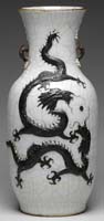CHINESE MOLDED HARDSTONE VASE. 20th century. Angular faceted vase in light green jade color with molded decoration overall and with scrolled handles. The underside of vase with an out-of-period seal mark. SIZE: 14-1/2″ h. CONDITION: Very good. 9-22834 (400-600)