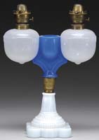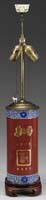 ORIENTAL OPIUM PIPE. Chinese. Cylindrical pottery bowl, underglaze blue decoration and calligraphy with craquelure fitted with a small lid within a repousse brass collar additionally fitted with a turned pipe stem. The whole within a molded metal holder joined to a swing handle. SIZE: 10″ h overall. CONDITION: Good. 9-24024 (200-300)
