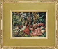 PHILIP BARTER (American, 1936-) “THE HEEP’S FARM MADRID, MAINE”. Oil on masonite landscape scene shows two large trees with house and barn beyond with foreground colorful flowers. Signed lower right “Philip”. Housed in a gray painted wood frame with linen liner. Title on reverse and dated “7/95″. SIZE: 24″ x 30”. CONDITION: Very good. 9-23769 (800-1,200)