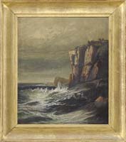 HARRISON BIRD BROWN (American, 1831-1915) CLIFFS OFF THE COAST OF MAINE. Oil on canvas coastal scene shows sharp cliffs with a continuing coastline with waves crashing on nearby rock ledge. Possibly a scene of Whitehead, Cushing Island, Portland Harbor. Signed lower left “HBBN”. Housed in what appears to be its original gilt oak frame. SIZE: 13″ x 11″. PROVENANCE: Maine Collection. CONDITION: Very good. 9-24183 (800-1,200)