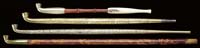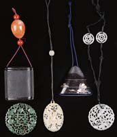 GROUP OF ASSORTED ORIENTAL PIECES. Chinese & Japanese, 19th century. Including a wood netsuke carved in the form of an ink stick, five stone beads including a jade example, decorated sword pommel and small carved ivory plaque. SIZE: Ink stick: 2″ x 7/8″. Largest bead: 1-1/4″ dia. Plaque: 1-3/4″ x 1-1/4″. CONDITION: Very good overall. 9-24211 (400-600)