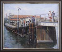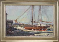 PAUL SOIK (American, Mid 20th Century) “CAMDEN HARBOR, MAINE”. Oil on canvas harbor view shows the green & white four-mast schooner tied to a dock with men working on deck conversing with a man on the dock. A mid-summer scene with blue sky & pink highlighted white clouds. Signed lower left and dated “1962”. Also signed, dated, and titled on reverse of canvas. Housed in a good carved wood frame with white liner. SIZE: 24″ x 36″. CONDITION: Inpainting, very good. 9-24890 (1,000-1,500)