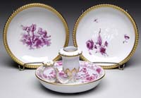 GROUP OF SIX ORIENTAL ITEMS. 19th/20th century. Lot includes three Chinese works: green scholar’s stone on stand, carved leaf form hard stone brush washer and soapstone paperweight in the form of a Ju-i. Along with three Japanese decorated ceramics: two oil bottles and a floral decorated bowl. SIZE: Bowl: 7″ dia. Scholar’s stone: 4-1/4″ x 7″. Ju-i: 8-1/2″ l. PROVENANCE: From a fine Islesboro, Maine home. CONDITION: Generally good. 9-23868, 9-23879; 9-23880; 9-23881; 9-23882 (150-250)