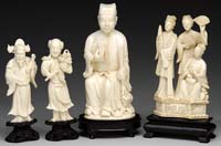IVORY GROUP AND A RICKSHAW. Oriental, 19th/20th century. Small polychrome carved ivory group depicting a figure at base of mountain landscape mounted on hardwood stand. Probably celluloid figure of rickshaw with female occupant carrying parasol. SIZE: 1) 1-1/2″ h. 2) 3-1/2″ h. PROVENANCE: From a fine Islesboro, Maine home. CONDITION: Good with old surfaces. 9-24795 (200-300)