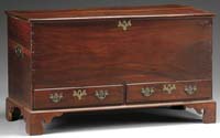 CHINESE MULTI-DRAWER MAHOGANY AND TEAK STORAGE CABINET. 2nd Quarter 20th century. Rectangular case with a pair of paneled doors opening to a fully fitted interior of two aligned short drawers over a bank of 11 long drawers, all with floral carved grips. The makers and retailers label affixed to the back; “J. L. GEORGE PROP/805 AVENUE ROAD/SHANGHAI, CHINA”. SIZE: 51″h x 38″w x 23-1/2″d. CONDITION: Structurally very good with shrinkage cracks at rear of top. 9-22725 (1,500-2,500)