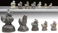 GROUP OF BRONZE WEIGHTS. 18th/19th Century Chinese. Each figural weight designed in the form of a rooster or duck, two in the form of a Foo dog. Ranging in size from 2 grams up to 162 grams. SIZE: From 1/2″ h to 2-1/4″ h. CONDITION: With old surfaces and good patina. 9-24673 (100-200)